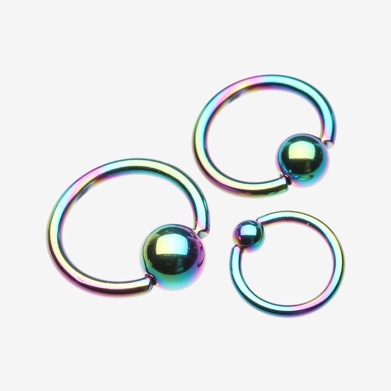 Add some zing to your piercings with this Colorline PVD Steel Captive Bead Ring! It's perfect for cartilage, eyebrows, septum, lips, lobes, and beyond! Whether you're a regular at the piercing parlor or you're just starting out, this unique rainbow ring wi